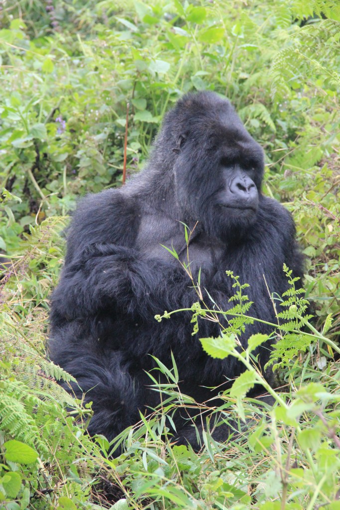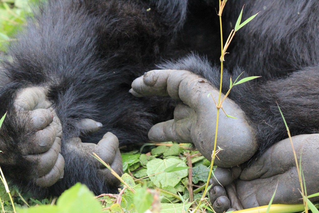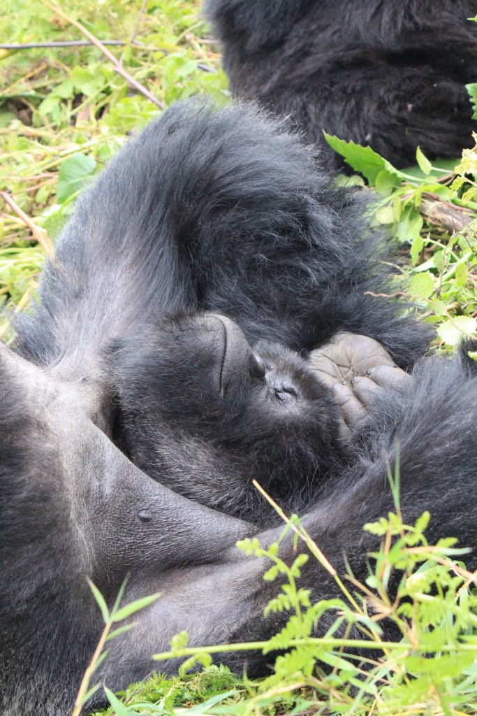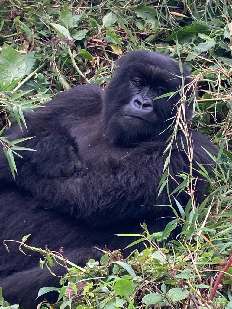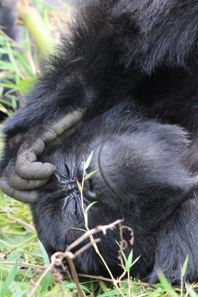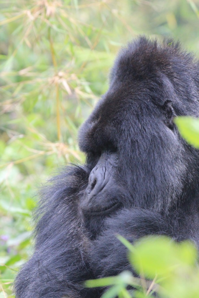 Nach gut zwei Stunden Aufstieg war es endlich so weit. Wir waren da, sahen aber noch keinen Gorilla. Francis erklärte, dass sie gerade Mittagsruhe halten würden. Frühmorgens verlassen sie ihr Nachtlager um sich vegetarisch zu ernähren. Das notwendige Wasser wird über die Pflanzen aufgenommen, so dass es keiner Wasserstelle bedarf. Nach der Mittagsruhe gibt der Silberrücken das Signal zur Nachtlagersuche. Aus hygienischen Gründen schlafen sie niemals zwei Nächte hintereinander im selben Nest. Es musss ja einen Grund haben, warum wir „nur“ 98 % der DNA teilen. Wir ließen unsere Rucksäcke zurück und setzten die Maske auf. Vor lauter Spannung beschlug ständig meine Brille, so dass ich befürchtete, den richtigen Moment zu verpassen, um auf den Auslöser zu drücken. Und dann standen wir neben unserem ersten Silberrücken. Es war ein jüngerer, der ein wenig abseits von der Gruppe im Dickicht saß. Was für tolles Geschöpf. Wir gingen noch ein paar Schritte und erreichten völlig unscheinbar auf einer Art Plateau die Igisha-Gruppe bei ihrer Mittagsruhe. In der Mitte saß der imposante Silberrücken, dessen tatsächliche Größe man nur erahnen konnte. Um ihn verteilt lagen die Weibchen und ließen sich von unserer Anwesenheit in keinster Weise stören. Zwei kleine Babys waren von der Notwendigkeit der Mittagsruhe nicht überzeugt und spielten stattdessen. Ein guter Freund in Kigali sagte einmal nach seiner Rückkehr vom Gorilla-Tracking, dass er es eher nicht als „life-changing“ empfunden hätte. Ich weiß nicht, ob es die richtige Bezeichnung dessen ist, was man in der Gegenwart eines Gorillas empfindet. Allein die Möglichkeit, diese Tiere aus nächster Nähe beobachten zu können, erachten wir als unglaubliches Privileg, was uns doch mit einer gewissen Demut zurücklässt.