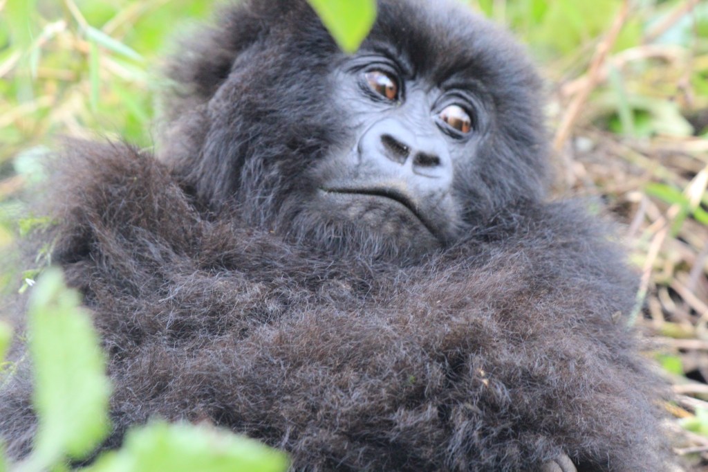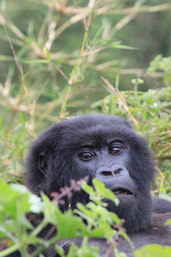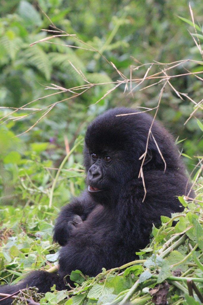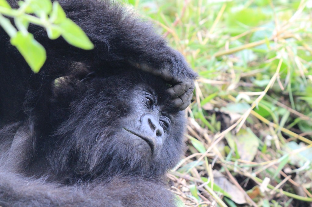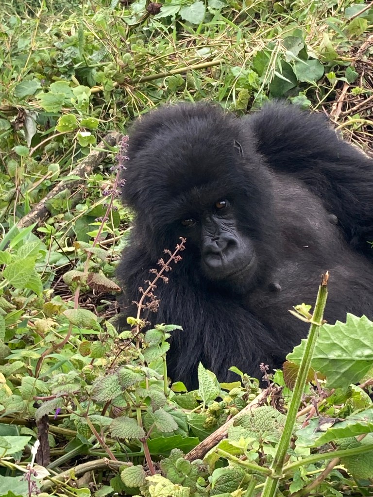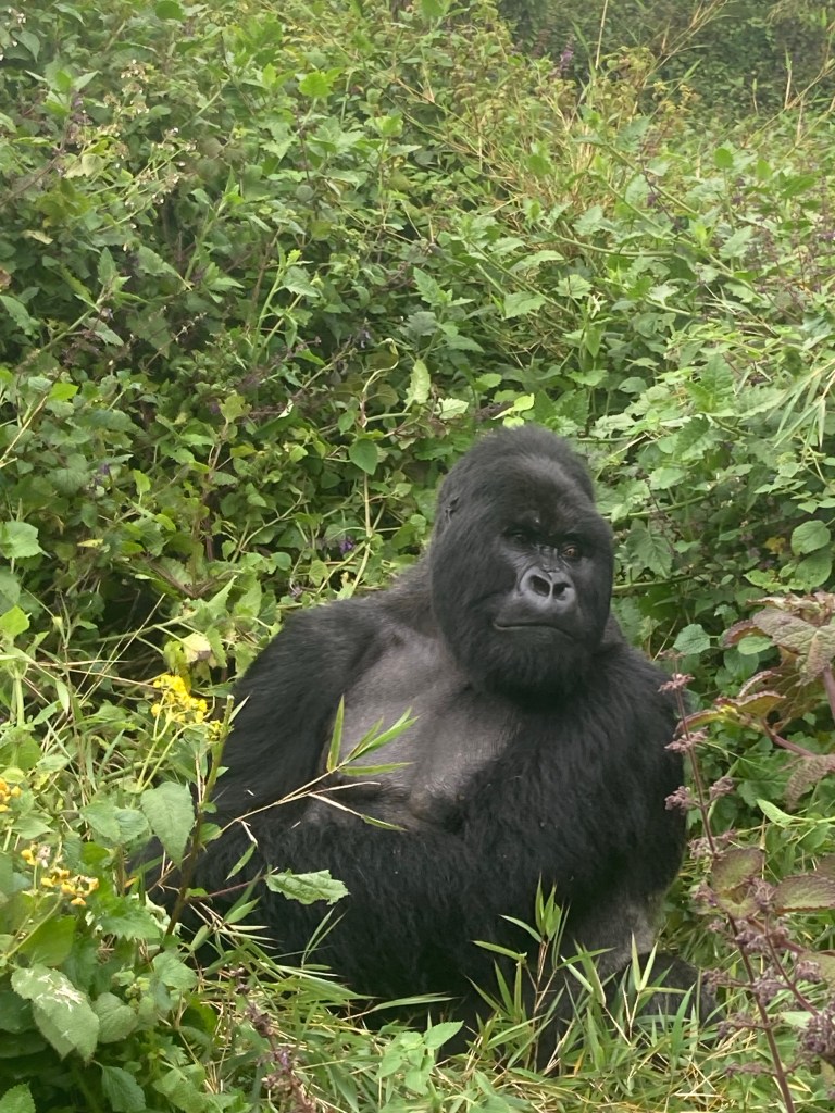Nach gut zwei Stunden Aufstieg war es endlich so weit. Wir waren da, sahen aber noch keinen Gorilla. Francis erklärte, dass sie gerade Mittagsruhe halten würden. Frühmorgens verlassen sie ihr Nachtlager um sich vegetarisch zu ernähren. Das notwendige Wasser wird über die Pflanzen aufgenommen, so dass es keiner Wasserstelle bedarf. Nach der Mittagsruhe gibt der Silberrücken das Signal zur Nachtlagersuche. Aus hygienischen Gründen schlafen sie niemals zwei Nächte hintereinander im selben Nest. Es musss ja einen Grund haben, warum wir „nur“ 98 % der DNA teilen. Wir ließen unsere Rucksäcke zurück und setzten die Maske auf. Vor lauter Spannung beschlug ständig meine Brille, so dass ich befürchtete, den richtigen Moment zu verpassen, um auf den Auslöser zu drücken. Und dann standen wir neben unserem ersten Silberrücken. Es war ein jüngerer, der ein wenig abseits von der Gruppe im Dickicht saß. Was für tolles Geschöpf. Wir gingen noch ein paar Schritte und erreichten völlig unscheinbar auf einer Art Plateau die Igisha-Gruppe bei ihrer Mittagsruhe. In der Mitte saß der imposante Silberrücken, dessen tatsächliche Größe man nur erahnen konnte. Um ihn verteilt lagen die Weibchen und ließen sich von unserer Anwesenheit in keinster Weise stören. Zwei kleine Babys waren von der Notwendigkeit der Mittagsruhe nicht überzeugt und spielten stattdessen. Ein guter Freund in Kigali sagte einmal nach seiner Rückkehr vom Gorilla-Tracking, dass er es eher nicht als „life-changing“ empfunden hätte. Ich weiß nicht, ob es die richtige Bezeichnung dessen ist, was man in der Gegenwart eines Gorillas empfindet. Allein die Möglichkeit, diese Tiere aus nächster Nähe beobachten zu können, erachten wir als unglaubliches Privileg, was uns doch mit einer gewissen Demut zurücklässt.
