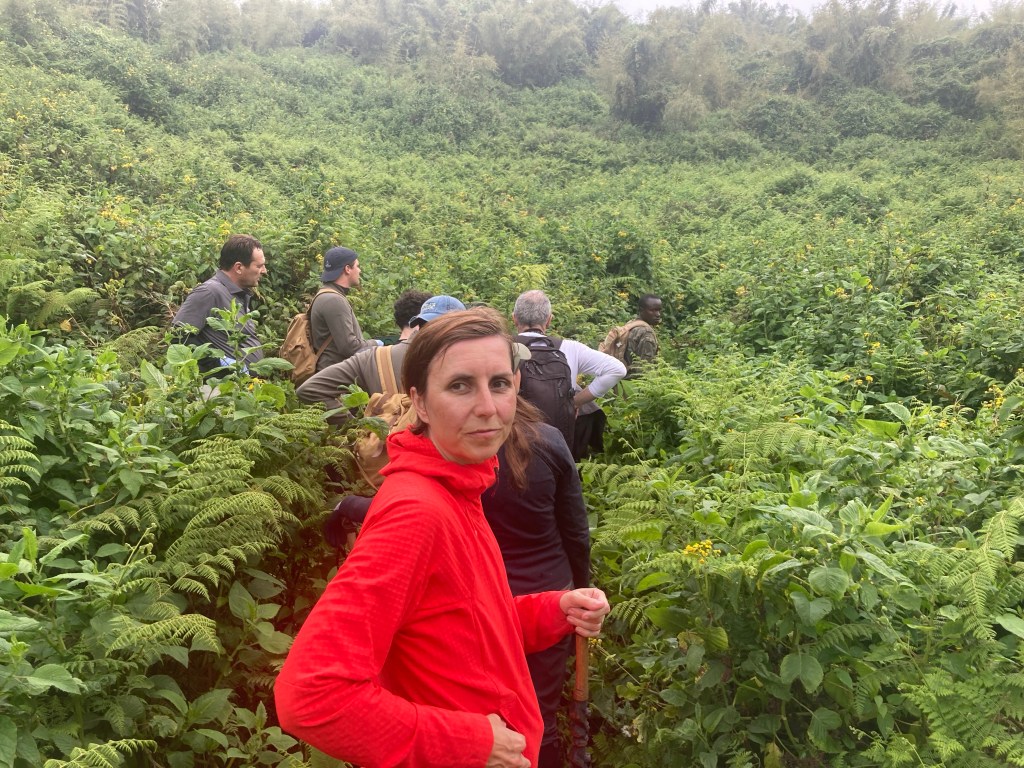 Wir erreichten unseren Ausgangspunkt nach abenteuerlicher Fahrt über unwegsames Gelände. Die Allradfunktion mit langsamer Untersetzung hätten wir nicht missen wollen, wobei die Bodenfreiheit diesmal viel wichtiger war. Francis zögerte nicht lange und mahnte zur Eile. Wir durchquerten ein paar landwirtschaftlich genutzte Flächen, um den Eingang des Nationalparks zu erreichen. Nichts deutete auch nur annähenderweise darauf hin, dass es sich hier um ein touristisches Gebiet handelte. Der schmale Pfad führte ins Nichts. Ein Dickicht aus tropischen Pflanzen, die regelmäßig den Weg zuwuchern, der sodann wieder mit der Machete frei geschlagen wird. Wir hatten Glück, denn es regnete nicht. Im Regen ist der Aufstieg doppelt anstrengend und man versinkt förmlich im Schlamm. Doreen wies auf die Stille hin, die man in Kigali allenfalls an Umuganda, dem monatlich wiederkehrenden kollektiven Arbeitseinsatz, spüren kann. Kigali entwickelt sich zunehmend zu einer typischen Großstadt mit allen Facetten. Wie würde es sein, wenn wir auf die Gorillas treffen? In jeder Gorillafamilie gibt es einen dominanten Silberrücken als Anführer, dem alle Mitglieder folgen. Er duldet keinen rivalisierenden Silberrücken innerhalb der Gemeinschaft. Wenn er stirbt, wird der Nächstältere das Oberhaupt. Wie wird es sein, wenn plötzlich acht neugierige Gesichter sich den Gorillas nähern? Francis erklärte uns die Verhaltensregeln, die unbedingt zu berücksichtigen seien. Leise sein, nicht essen, nicht trinken, nicht husten, die Gorillas nicht anfassen, wobei es sein könnte, dass die jungen Babys uns aus lauter Neugier anfassen, nicht panisch werden, wenn der Gorilla auf uns zukommen sollte. Wir hatten keine Ahnung, ob wir panisch reagieren würden, hatten wir doch eine solche Situation noch nie erlebt. Francis versicherte uns, dass Berggorillas absolut friedliebende Lebewesen seien. Er hätte in 25 Jahren noch nie erlebt, dass ein Gorilla einen Touristen angegriffen hätte. Als Zeichen unserer friedlichen Absicht sollten wir aber in der Nähe eines Gorillas regelmäßig einen Laut von uns geben, den man nicht beschreiben kann. Er geht ungefähr so: